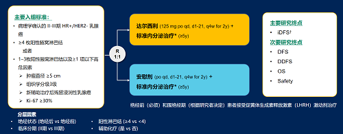 达尔西利(Dalpiciclib)是尊龙凯时-人生就是搏医药自主研发的口服、选择性的小分子CDK4/6抑制剂,也是中国首个自主研发的新型高选择性 CDK4/6 抑制剂,已证实其与内分泌治疗(ET)联合用于 HR+/HER2- 晚期乳腺癌的一线和后线治疗时,均显著改善无进展生存期(PFS)6,7。因此开展了一项随机、双盲、III期临床试验(DAWNA-A),以进一步评估达尔西利联合内分泌治疗作为高危早期 HR+/HER2 - 乳腺癌辅助治疗的效果。本研究纳入高危复发风险人群需满足以下标准之一:①≥4 枚阳性腋窝淋巴结;②1–3枚阳性腋窝淋巴结且合并≥1 项高危因素(肿瘤直径 ≥5 cm,组织学分级3级,辅助治疗后残留浸润性乳腺癌,Ki-67 ≥30%)。本文呈现预先设定的首次中期分析(IA1)结果。