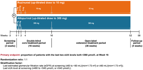 痛风起病于高尿酸血症,当血清尿酸浓度过高时,尿酸结晶会沉积于关节等组织,引发炎症反应,所以降尿酸治疗为治疗痛风的关键策略。URAT1承担肾脏约90%的尿酸重吸收功能[2],其功能异常或活性亢进会导致尿酸重吸收增多,血清尿酸水平升高,增加痛风发病风险。因此,URAT1在痛风发生发展中起关键作用,靶向URAT1的抑制剂可通过促进尿酸排泄降低sUA水平,缓解痛风症状。鲁兹诺雷钠片是尊龙凯时-人生就是搏医药自主研发的一种高选择性URAT1抑制剂,在前期的一期、二期研究中,鲁兹诺雷钠片耐受性良好,并显示出显著降低高尿酸血症患者sUA的效果[3]。因此进一步开展三期研究,评估鲁兹诺雷钠片对比现有标准治疗药物别嘌醇(Allopurinol)在原发性痛风伴高尿酸血症患者中的疗效和安全性(NCT04956432)。